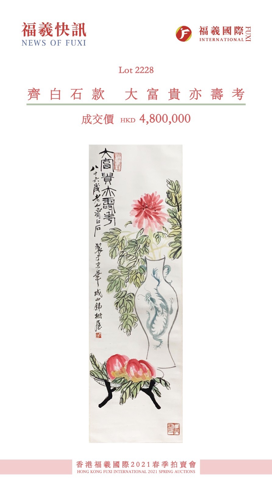 在預展期間LOT2228齊白石 大富亦壽考就廣受藏家關註,現場更是引來頻頻舉牌競價,最終以4,800,000元的高價落槌,書畫板塊呈現出喜人的市場表現,給了我們很大的信心,在未來我們會繼續擴展更加多元的拍品門類,在此感謝各位藏友的支持與信任,也感謝各位合作方的積極配合,10月份秋季拍賣會,期待您的關註與參與。