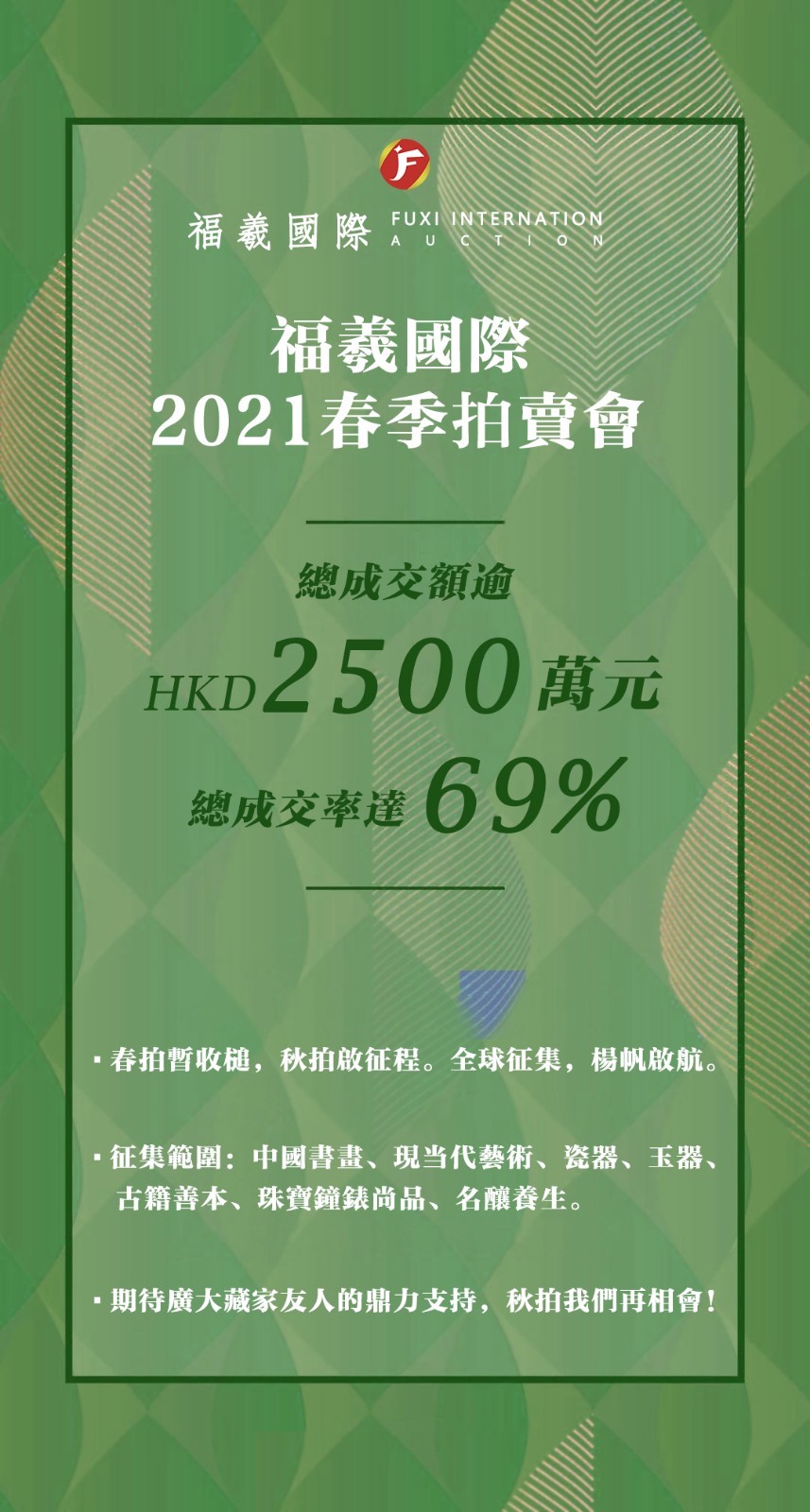 香港福羲拍賣2021春季拍賣會國內首秀,7月25日晚上19:00依次舉槌,總成交率為69%,總成交額2500萬,藏家們踴躍競拍的熱情持續高漲,網絡平臺和電話及書面委托均保持著旺盛的出價勢頭,為香港福羲國際拍賣的國內首場春拍帶來一股勁爽的活力。