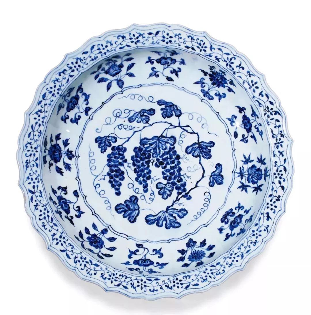 明永乐 青花开光葡萄折枝花卉菱口折沿大盘