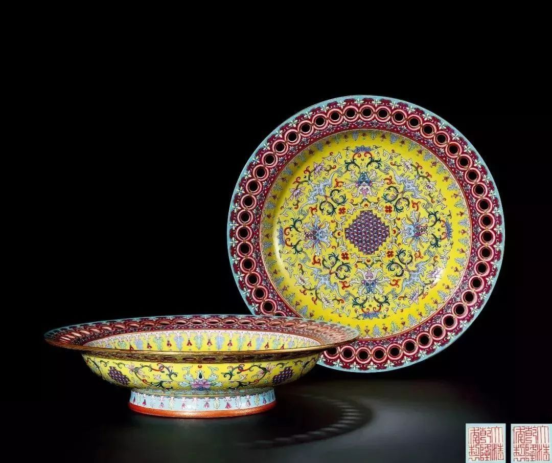 清乾隆 黄地粉彩描金莲蝠纹镂雕多孔折沿盘一对