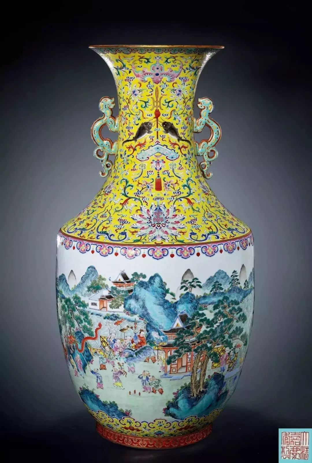 清嘉庆 黄地粉彩婴戏图双耳大瓶