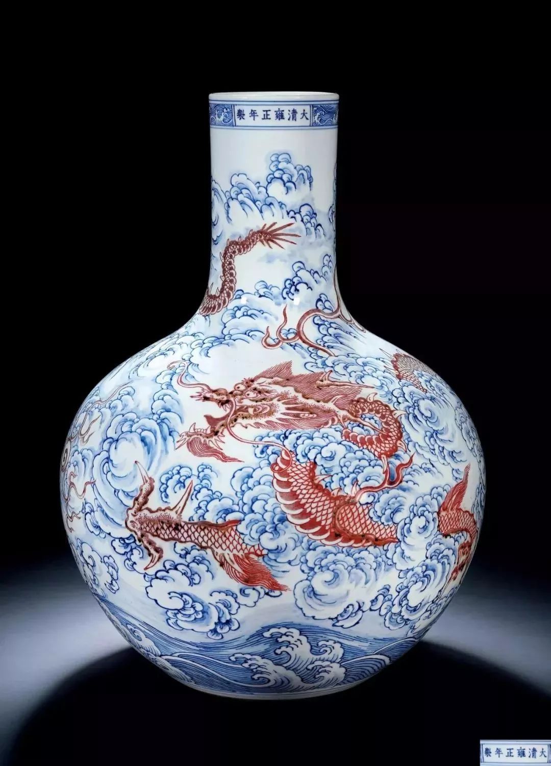 清雍正 御制青花釉里红云海腾龙大天球瓶