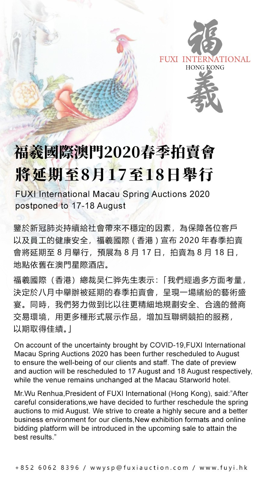 香港福羲国际拍卖行将原定于2020年6月26日举行的澳门拍卖会更改至2020年8月18日,现宣布通过如下具体日程安排,呈献一系列顶尖艺术及雅逸精品。